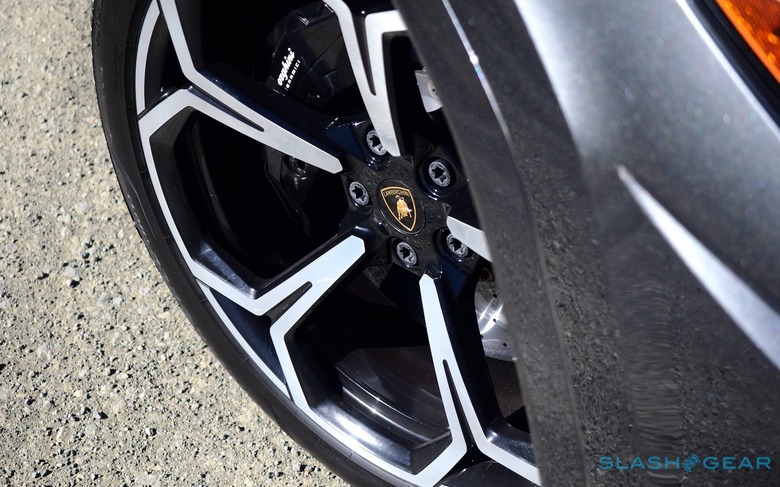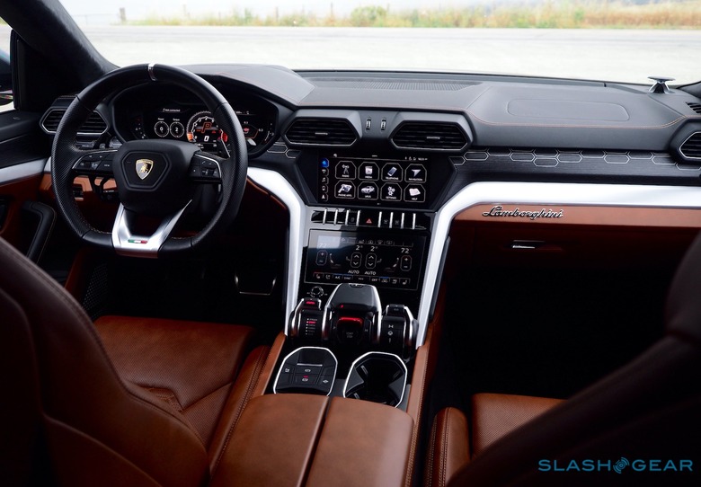 Inside, meanwhile, it's a mixture of classic Lamborghini, some bizarre detailing, and, yes, some parts-bin sharing with Audi. The center console is a reminder that Lamborghini has never met a surface it doesn't deem worthy of extra creasing. The vents and switchgear are sculpted and embellished. Audi donates its twin-touchscreen infotainment system, tweaked a little up top with some custom graphics; yes, the critics may scoff, but if you've going to borrow software then this is at least a decent system to crib from.