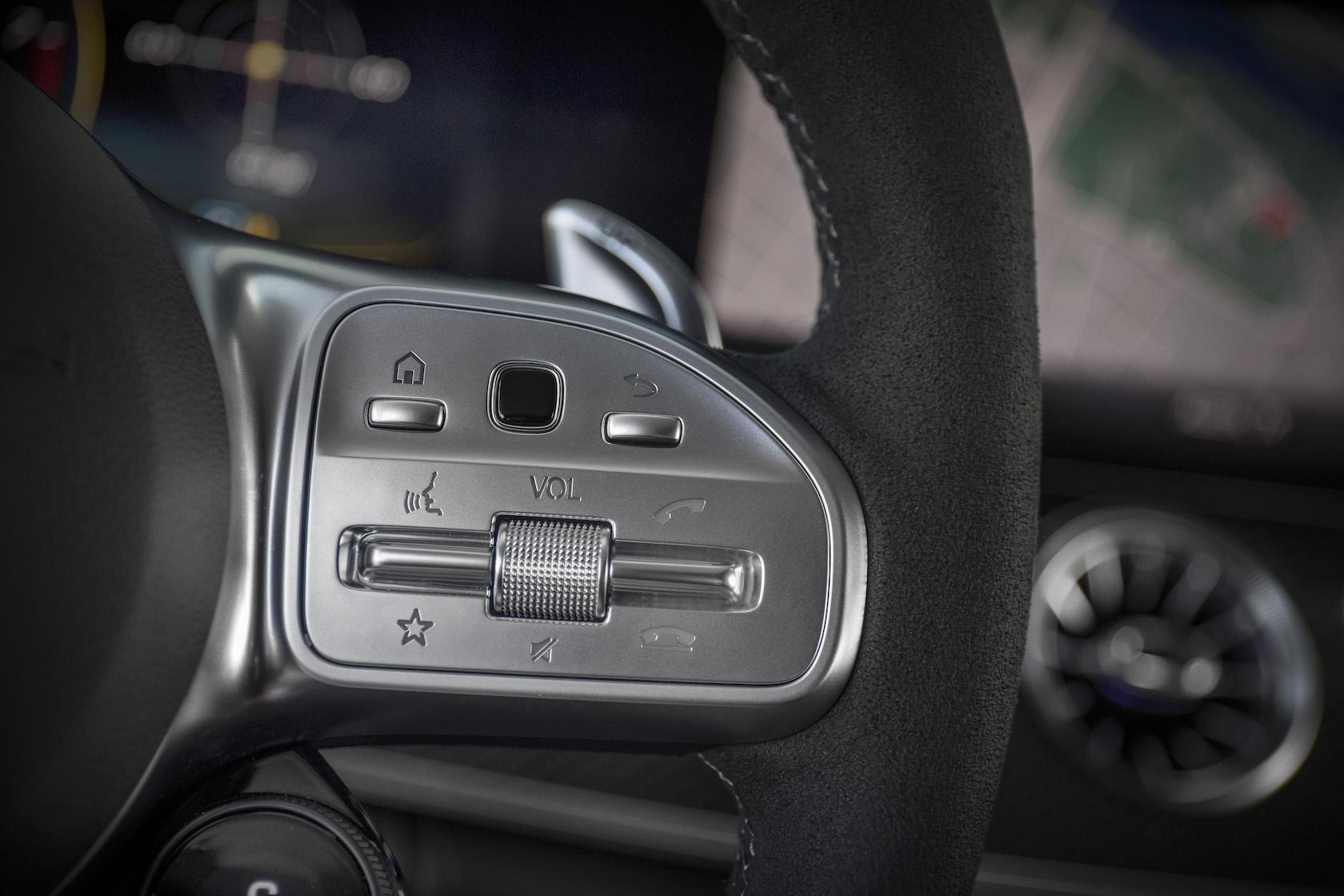 Nice as it might be to stay on the track all day, eventually the 2019 Mercedes-AMG GT 4-Door has to venture onto more humdrum asphalt. It's down to the AMG Dynamic Select Function to bring the beast in line, adjusting the engine, transmission, suspension, and exhaust behaviors accordingly. Switching to Comfort, the suspension gets noticeably more supple and the flaps in the exhaust system are closed, tempering the soundtrack unless you lean hard on the accelerator. The AMG Dynamics handling is adjusted to Basic mode, prioritizing higher yaw damping for flatter cornering.