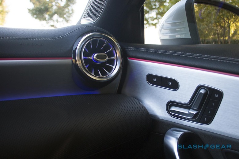 The interior of the A-Class is designed well, with plenty of room: it has the feel of a much larger car. You get a big panoramic glass roof as standard, while the backlit, turbine-inspired air vents have been taken from Mercedes-Benz's more expensive offerings. There are 64 different colors available for the ambient lighting, and you can even set it to change the color of the air vents as you increase or decrease the temperature.