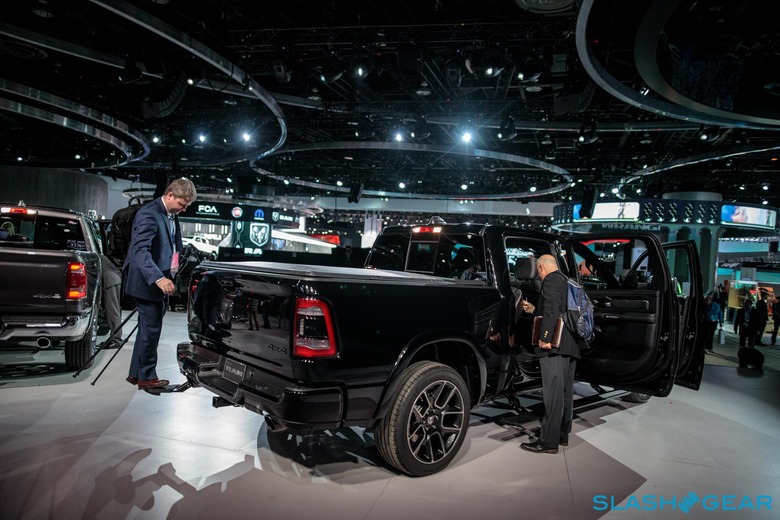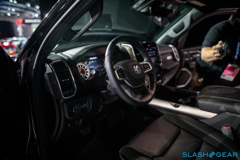 The dashboard is maybe the most dramatic departure from the old pickup, however. There you find a huge, portrait aspect 12-inch touchscreen in the top-spec trim (or a 5-inch or 8.4-inch touchscreen in lower trims) with Android Auto and Apple CarPlay, available 3D navigation and a 360-degree bird's eye camera system, and the fourth generation of FCA's Uconnect infotainment software. There's also the option of a 19-speaker Harman Kardon audio system, mustering a whopping 900 watts and including a 10-inch subwoofer and active noise cancellation.