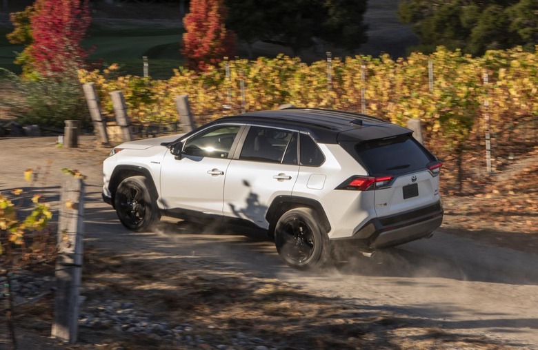 The 2019 RAV4 Adventure trim is built for the rough stuff. You get high-rise roof rails, larger over-fenders, and a more aggressive bumper and grille design top further emphasize the go-anywhere theme of the new RAV4. The Adventure grade also gets new 19-inch split-spoke alloy wheels, 8.6-inches of ground clearance, active grille shutters, available Mocha-colored SofTex seat finishes, and orange stitching accents in the interior. The 2019 Toyota RAV4 Adventure with all-wheel drive starts at around $32,900.
