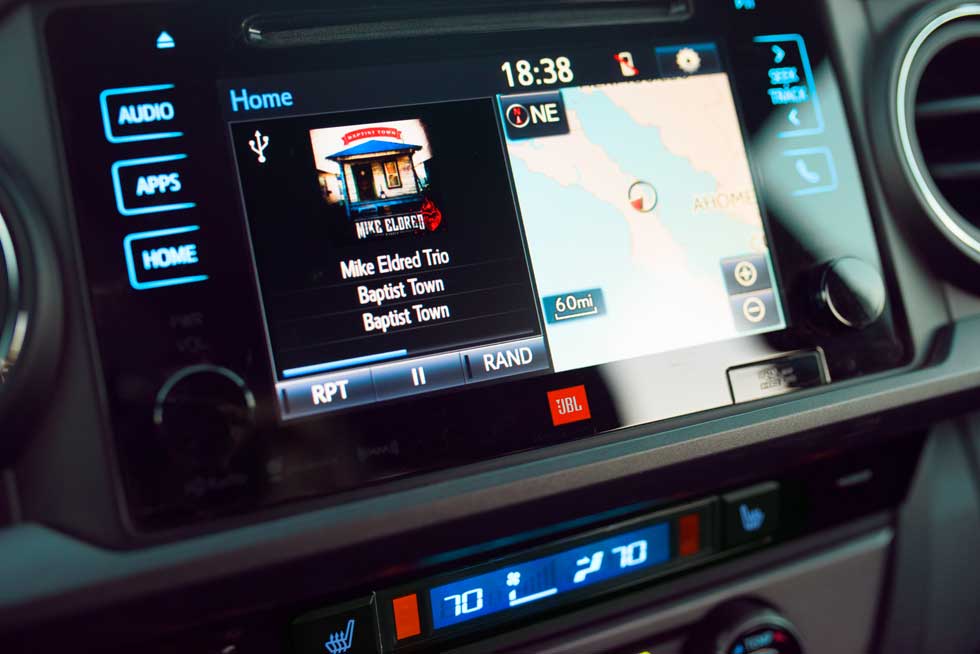 That vehicle has Entune Premium JBL audio with a subwoofer and integrated NAV. Rigid Industries fog lights are included and the truck rides on 16-inch TRD Pro black wheels. A TRD Desert Air Intake is optional and helps reduce dust the truck might slurp up by moving the intake up by the windshield from the fender well.