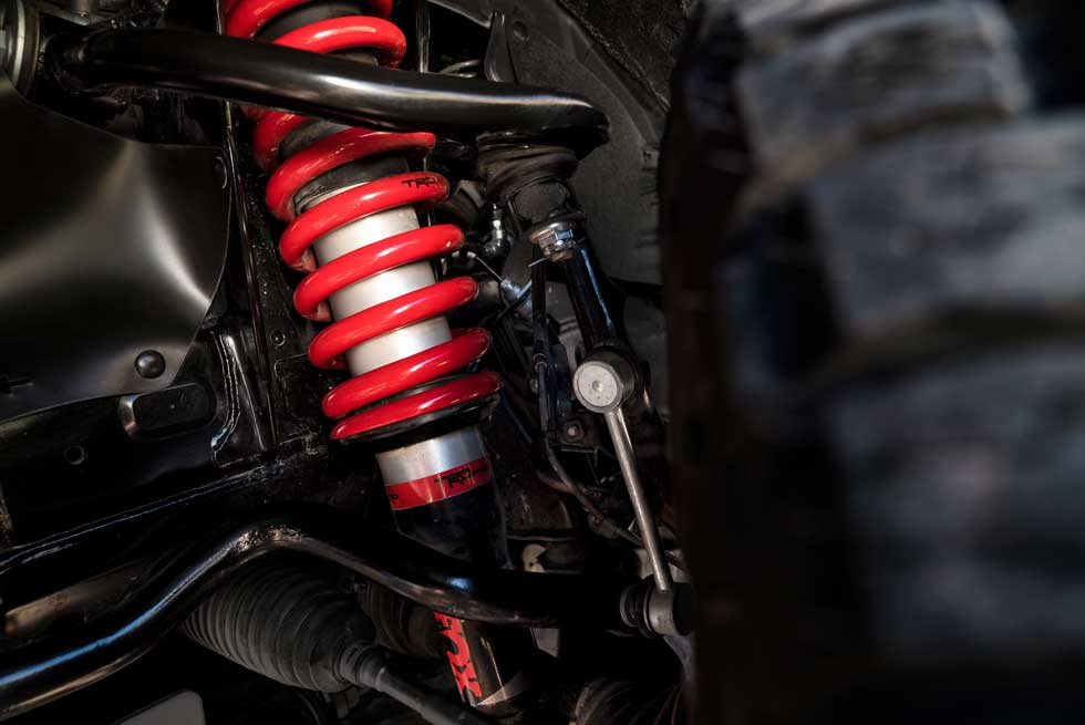 That blue hue is a TRD Pro exclusive color found on no other Toyota trucks. Each of the vehicles gets Fox shocks tuned exactly for it at TRD. Toyota says that the design of the shocks allows for a plush ride on the roads but stiffens to prevent bottoming during hard use. The Tacoma TRD Pro uses shocks with 46mm piston and 8 bypass zones combined with springs that lift the front of the truck by an inch.