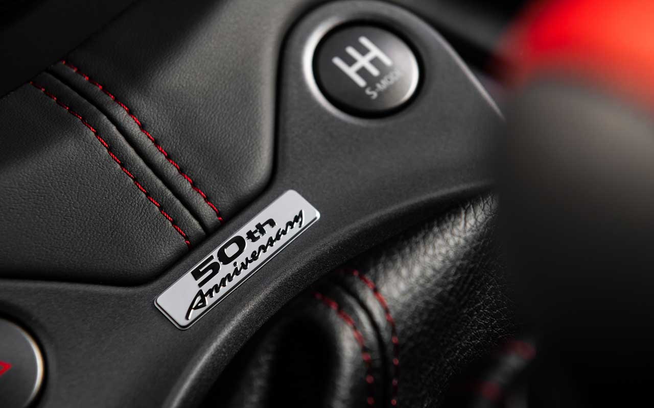 The car has LED daytime running lamps and high-intensity discharge bi-functional xenon headlights with auto on/off. Inside the car is an interior that has special "50th Anniversary" badge on it and leather and suede heated 4-way power seats with adjustable lumbar support. The 50th Anniversary logo is embossed on the backrests of the sets.