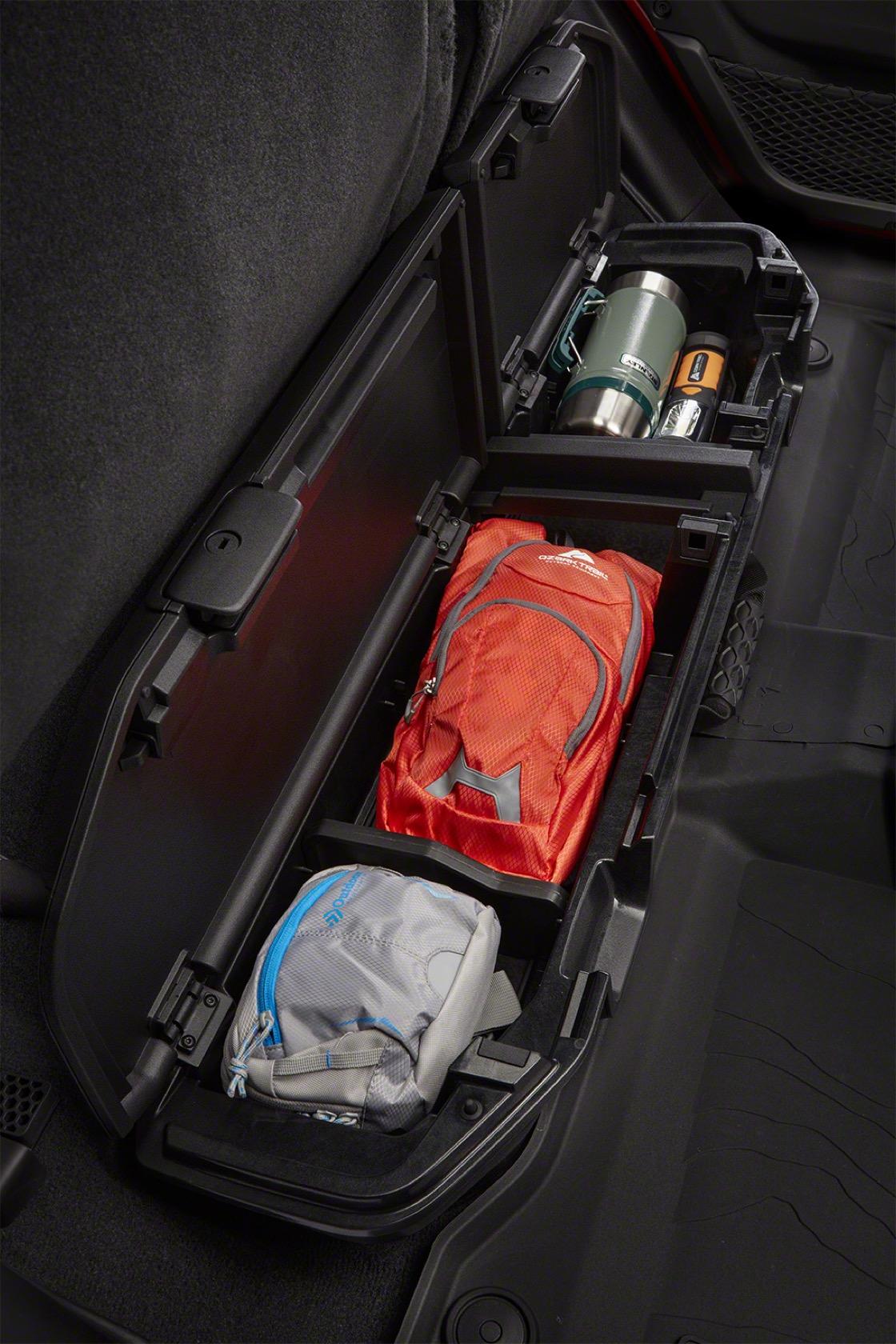 Cloth or leather contoured seats support adjustable bolster and lumbar support. Heated front seats and a heated steering wheel are optional. The rear seas, meanwhile, can be folded flat – with LED lights illuminating the storage space opened up that way – but can also be locked into place to make for secure storage behind the seat back. An optional lockable bin provides safe storage even when the roof and doors are removed, or the windshield is lowered.