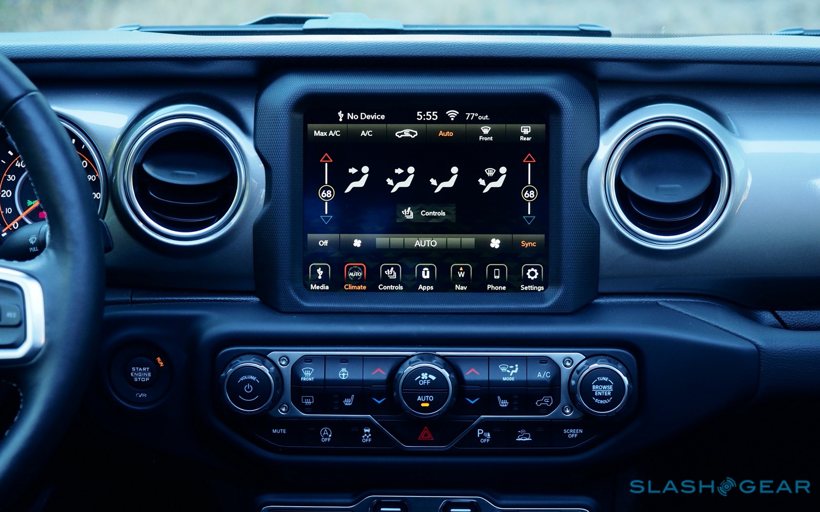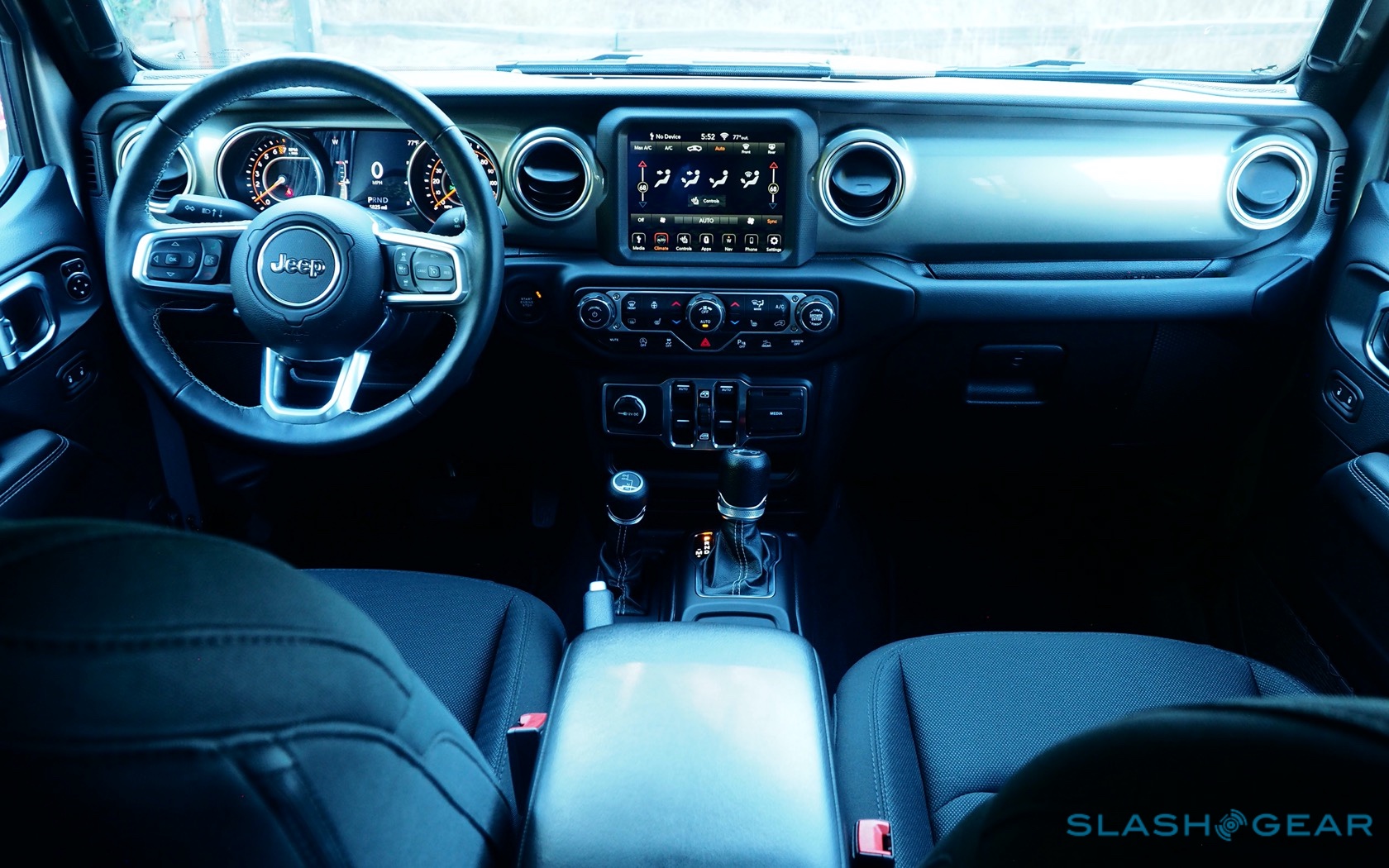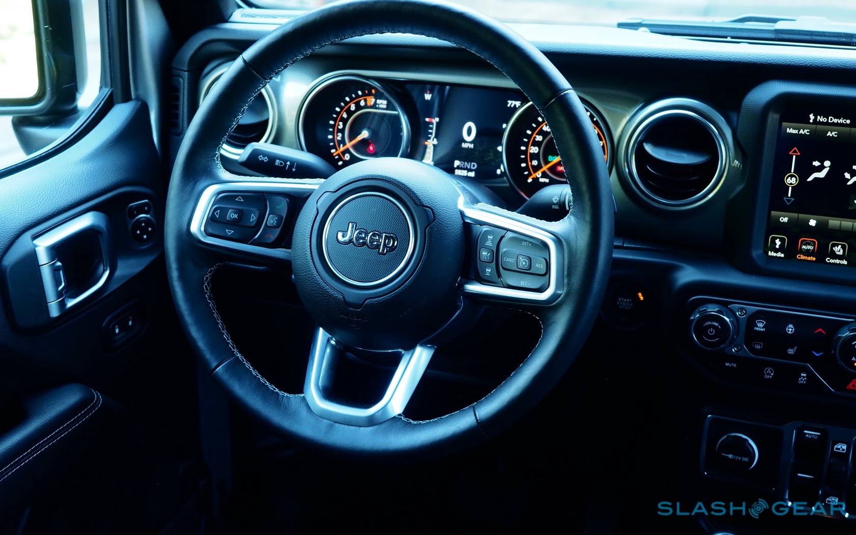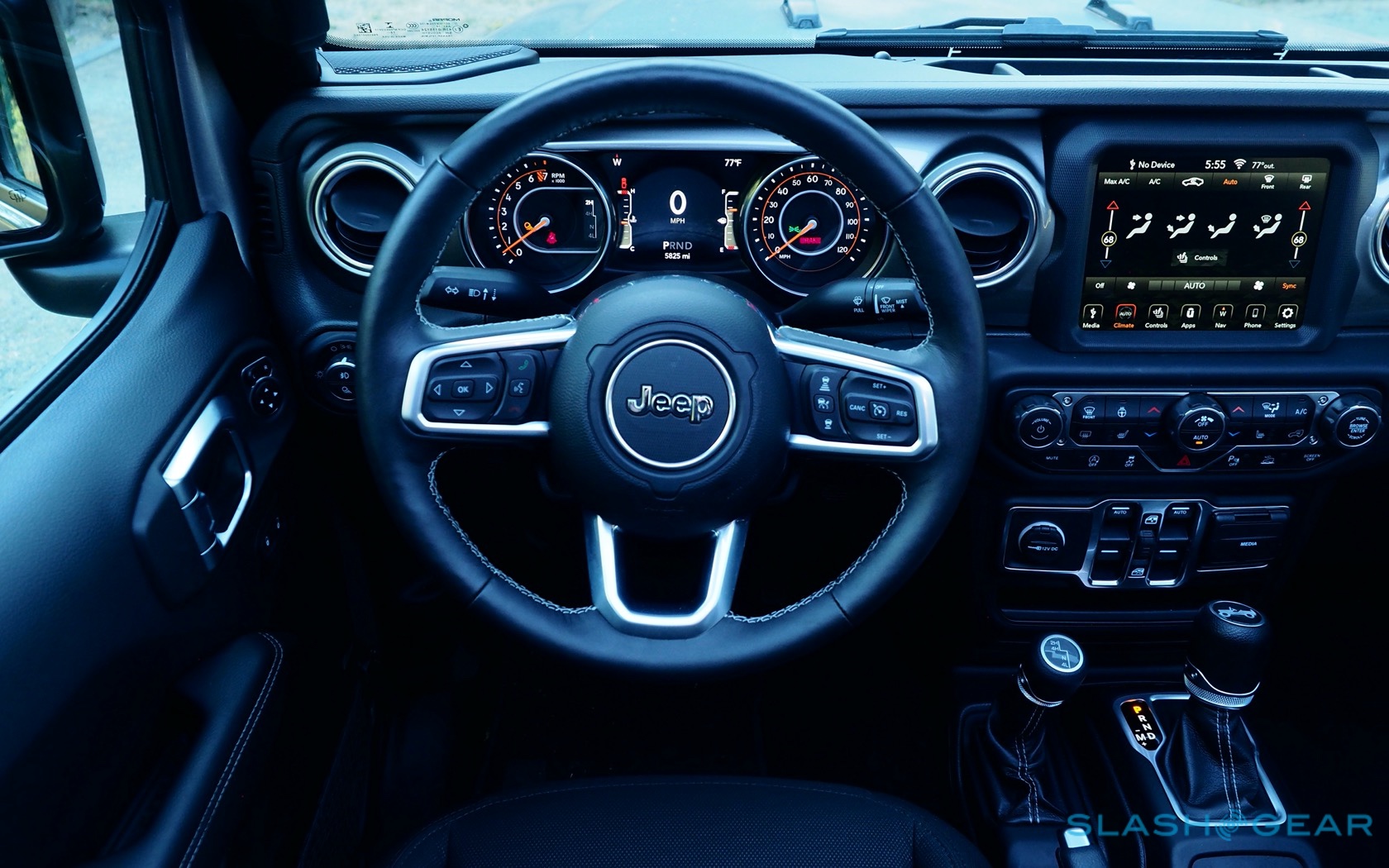 Inside, the familiarity carries over. Jeep's cliff-face of a dashboard has plenty of buttons and knobs, surrounding – in these trims, at least – an 7-inch touchscreen infotainment system running Uconnect. The UI may look a little cluttered in places, but it's fairly straightforward in how it's all laid out, and reacts without lag. An 8.4-inch upgrade with navigation and an Alpine audio system is $1,595; either way you get Apple CarPlay and Android Auto.