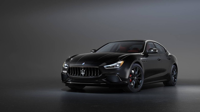 That package includes black chrome finishing on the grille upper bezel trim, rear trunk accent, side air vents, Maserati badges on the c-pillars, as well as the model, engine, and vehicle name on the rear. The window surrounds, exhaust tips and vertical grille bars are all black, and the wheels are 20-inch dark-colored units with red brake calipers.
