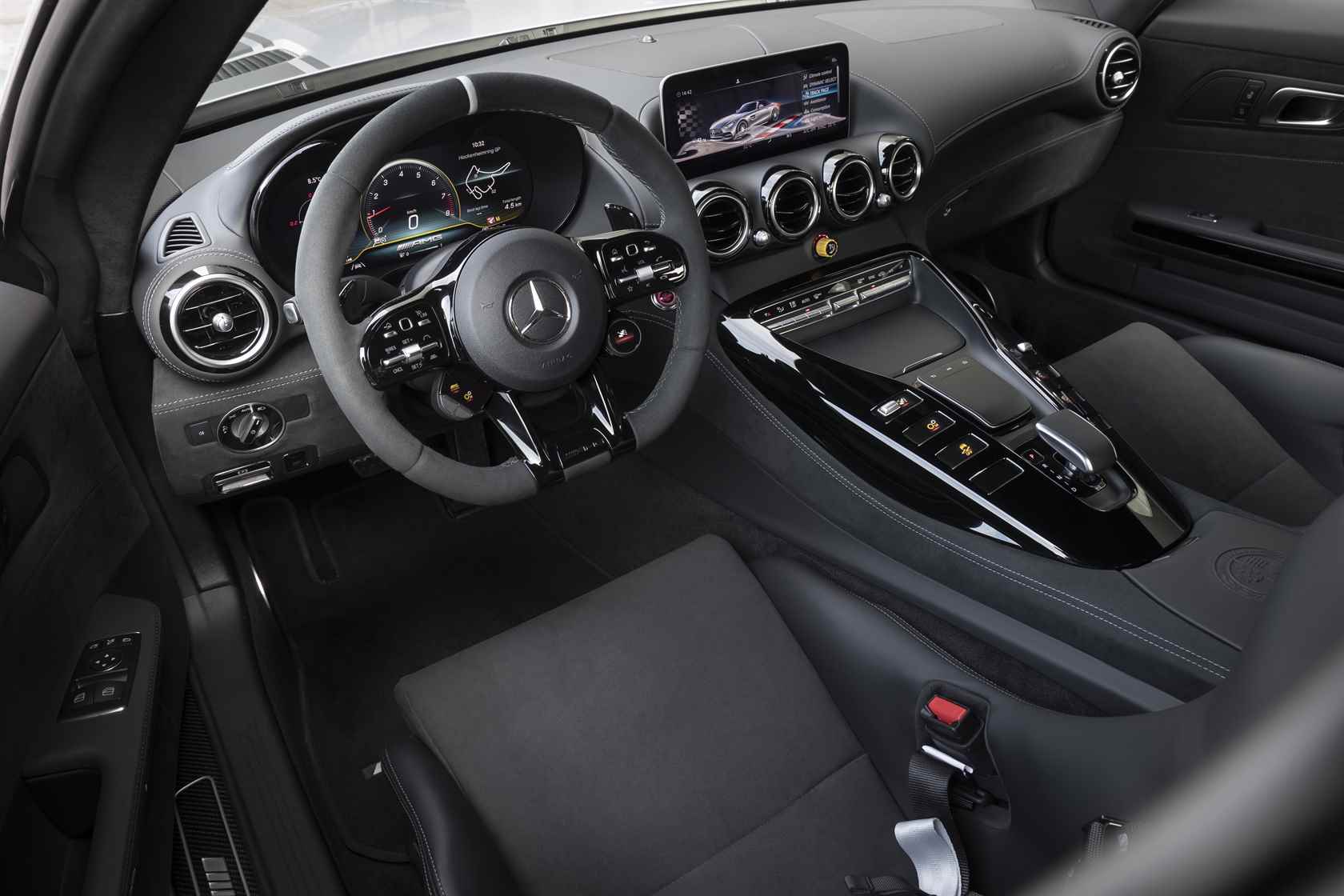 The GT R Pro comes standard with a bevy of carbon-fiber trim and components including front splitters, fender fins, side mirrors, rear spoiler, and rear diffuser. The spoiler is even fitted with a spoiler lip to further increase downforce in the rear axle. And as with all AMG GT models, the GT R Pro also comes with a redesigned carbon-fiber roof to lower the center of gravity. When all is said and done, the GT R Pro can produce 200 pounds of additional downforce at 155 mph compared to the GT R with approximately two-thirds of the downforce pushing over the front axle.