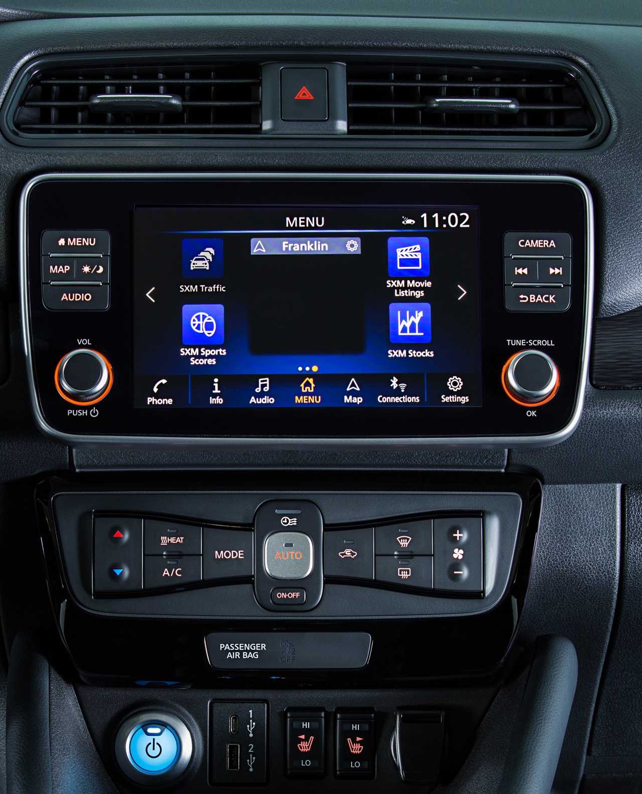 All 40 kWh Leaf cars get a standard 8-inch touchscreen display. The entire Leaf range gets Apple CarPlay and Android Auto. Driver and front passenger knee airbags and rear seat-mounted outboard side-impact supplemental airbags are standard on all models. Nissan is also adding an optional Sunset Drift ChromaFlair paint color later in the year.