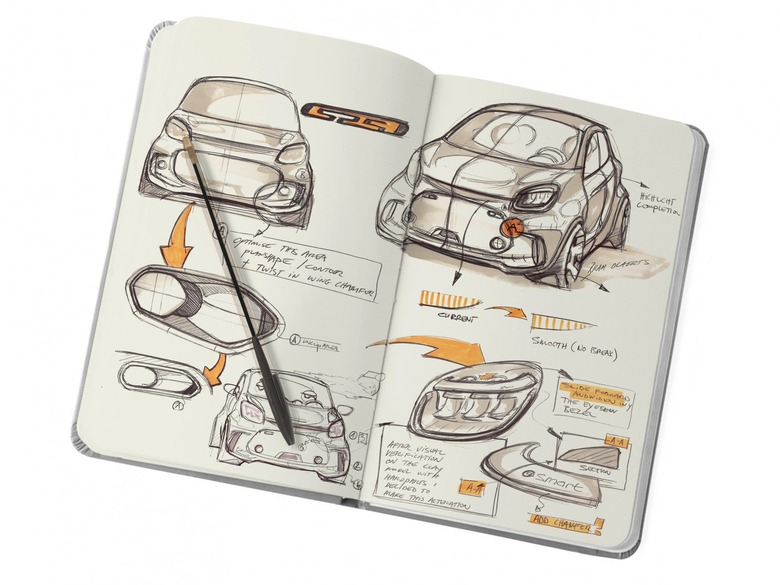 It's that post-facelift Smart that we're seeing hints of here. While the sketches are obviously exaggerated for stylistic effect, it looks like the EQ fortwo will get a bolder, more aggressively proportioned design. The grille is bigger, plunging deeper into the front bumper, while the detailing will be pared back to leave the EV cleaner and less fussy.