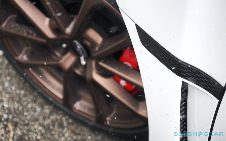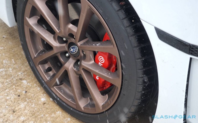 The Series.White car gets keyless entry and push-button start, LED fog lights, and steering responsive headlights. That's nice for a WRX, though everyone else would be forgiven for just assuming every new car had them. The matte bronze 18-inch wheels offset the Ceramic White paint well, too, though I wish the WRX got the silver Brembo calipers of the WRX STI Series.White rather than the red. Then again, I prefer the smaller, subtler spoiler on the non-STI car, so I'll accept the compromise.