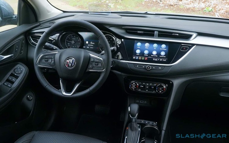 The Encore GX's cabin feels a little less oppressively-dark than Chevy's does, though not by much. Essence trim gets power adjustment for the front seats, dual-zone climate control, a heated leather-wrapped steering wheel, leather trim, keyless entry and start, and a useful 120V outlet. The driver has a 4.2-inch display sandwiched between the analog gauges, while there's an 8-inch infotainment touchscreen with Android Auto and Apple CarPlay support along with baked-in 4G/LTE and WiFi hotspot.