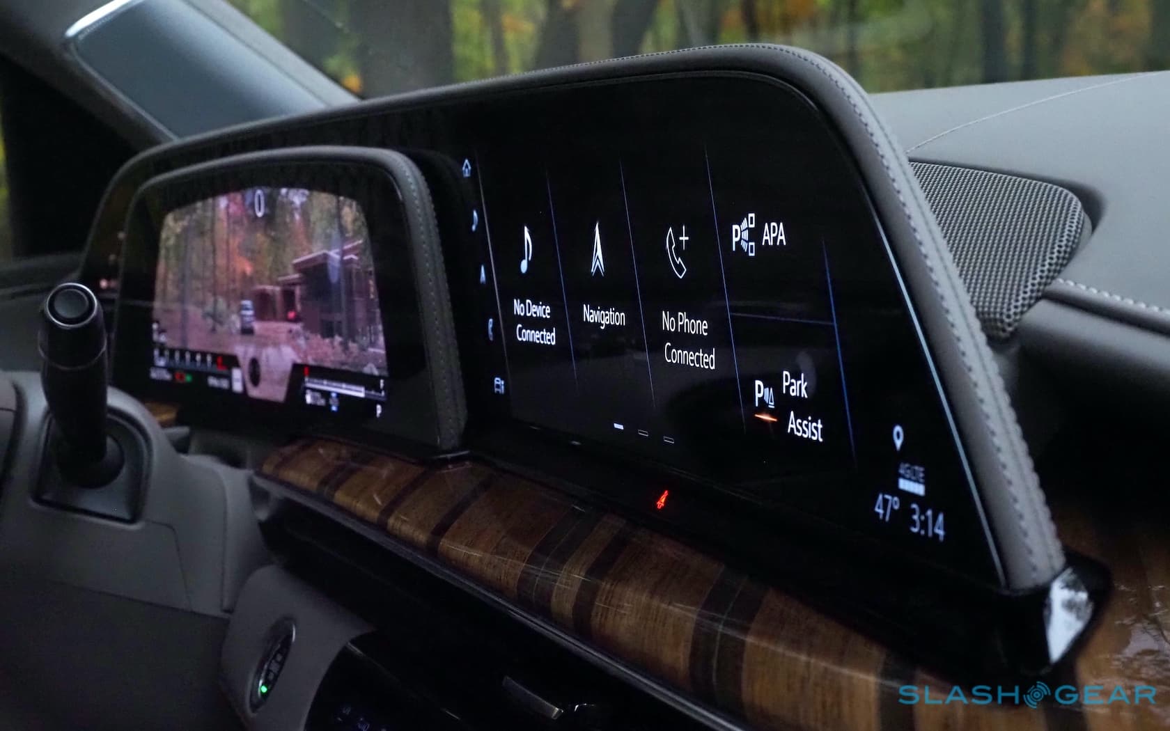 First thing you see inside is the vast display. Or, more accurately, three displays: the Escalade's dashboard is topped by a trio of curved OLED panels that collectively measure 38-inches. The driver gets one for their instrumentation, plus a small touchscreen to the left that has the trip computer display and settings for the head-up display and gauge layout. A 16.9-inch panel handles infotainment and navigation duties.