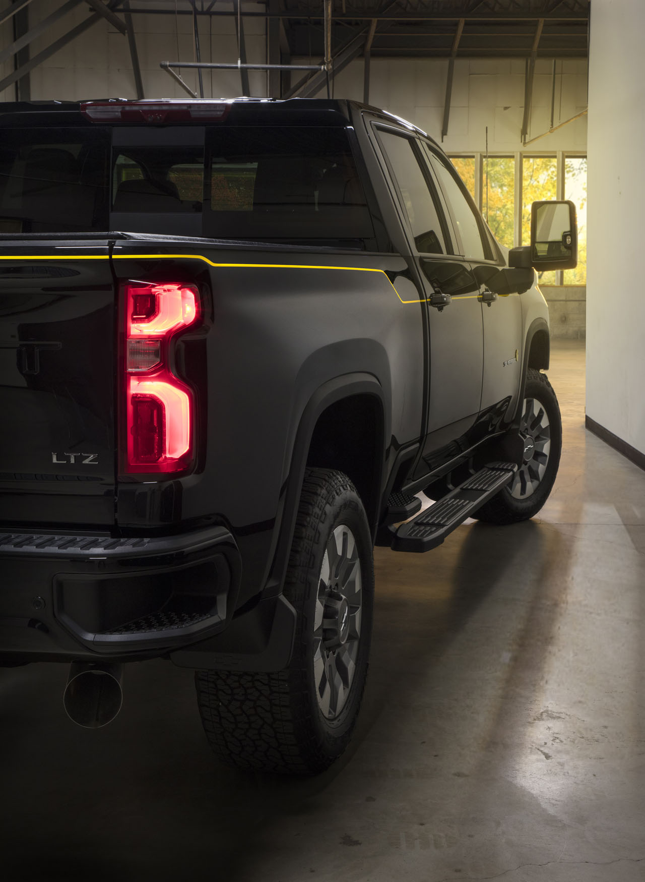 The Rear Trailer View camera offers guidelines and a trailer-angle indicator, and the rear side view capability has been enhanced. There are several special editions of the Silverado HD pickup, including the Carhartt Special Edition pictured here that's offered exclusively on the LTZ. Another is the Midnight Edition offered on black LTZ and LT trims, offering a blacked-out appearance and standard mud-terrain tires.
