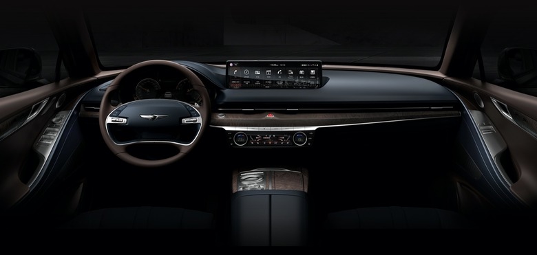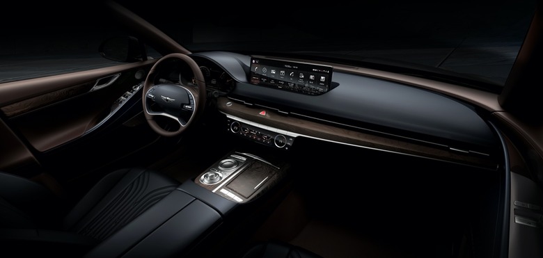Inside, meanwhile, the theme of focusing on surface shapes rather than unnecessary detailing continues. Genesis thinned the A-pillars and trimmed down the rearview mirror, to maximize forward visibility. The dashboard is a long, curvaceous sweep, bowed down in the center with the HVAC controls.