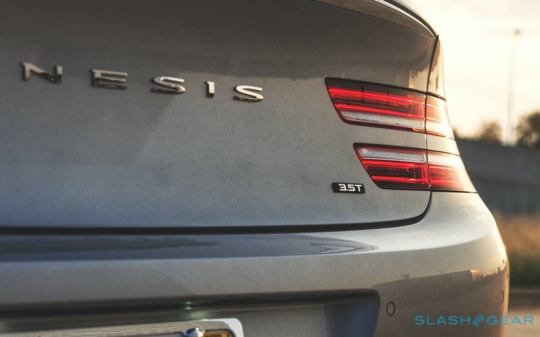 Genesis is proud of its new, brand-exclusive rear-wheel drive platform, and the G80 telegraphs that clearly. The overhangs are crisp and short; the hood a long, sharply-creased expanse; and the roofline flows elegantly into the deck-lid. Viewed from the side, there's a sweeping shoulder line that arcs back, from over the front wheels and along the doors, to meet the rear lights. They echo the same quad signature as the front, the Genesis brand picked out across the concave rear. From so many angles, it's as much about how the bodywork catches and reflects the light as it is the shape of the metalwork itself.