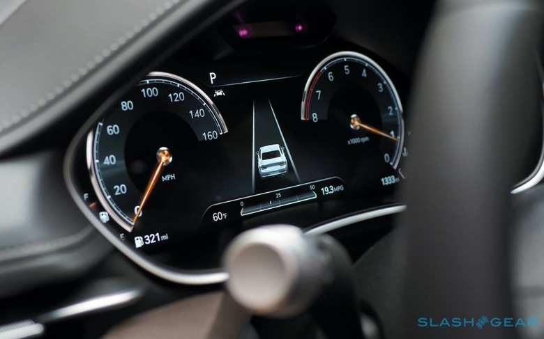 As for the 3D instrument cluster – available only on the 3.5T Prestige – that uses an eye-tracking IR camera to deliver a three-dimensional interface for the driver's gauges. It works, though since it hews off half the screen's resolution for each eye, the graphics are noticeably less crisp than in 2D mode. I'd rather Genesis had used the camera for a hands-off driver assistance mode: the G80's Highway Driving Assist II system is standard on all trims, combining adaptive cruise control and lane-keeping, but you still need to keep a hand on the wheel while it's at work.