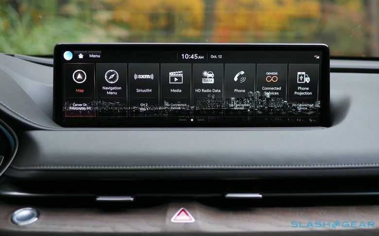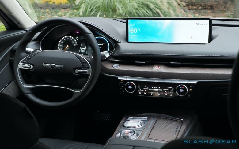 A wide, 14.5-inch touchscreen dimples the dashboard for infotainment duties, its graphics crisp and bright. Genesis' UI is clean and easy to navigate, but it's just as willing to cover that all up with an ethereal screensaver to match the cabin's Zen. A glass touchpad in the center console handles text entry, with a metal scroll wheel surrounding it; a matching knob takes care of transmission duties.