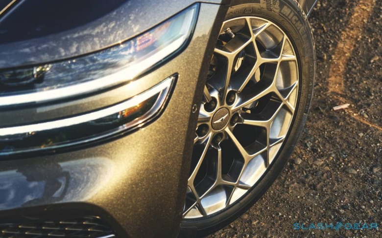 In short it's a triumph, muscular and attention-grabbing, and perhaps most important it doesn't ape what Audi, BMW, or Mercedes are doing. The same can be said for Genesis' wheel options. My G80 3.5T test car came on some relatively conservative five-spoke alloys, though the Spider-man-esque webbing around the hub suggests the design team couldn't quite resist making them unique. Better still, though, were the spiky fractals that graced the G80 2.5T I lived with next, each a shuriken snowflake ripe with dynamic tension.