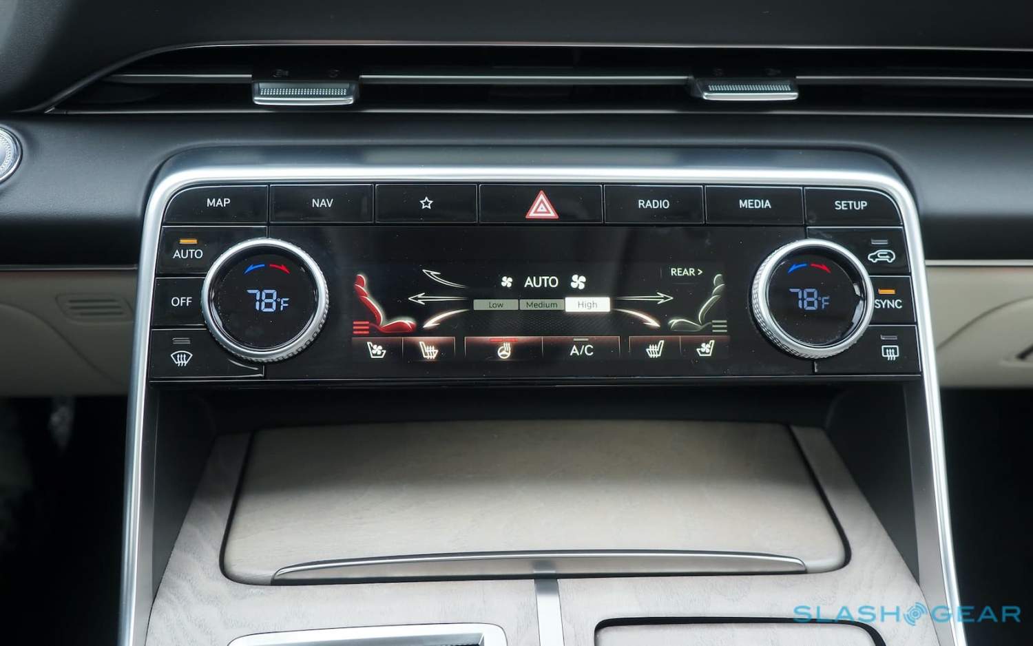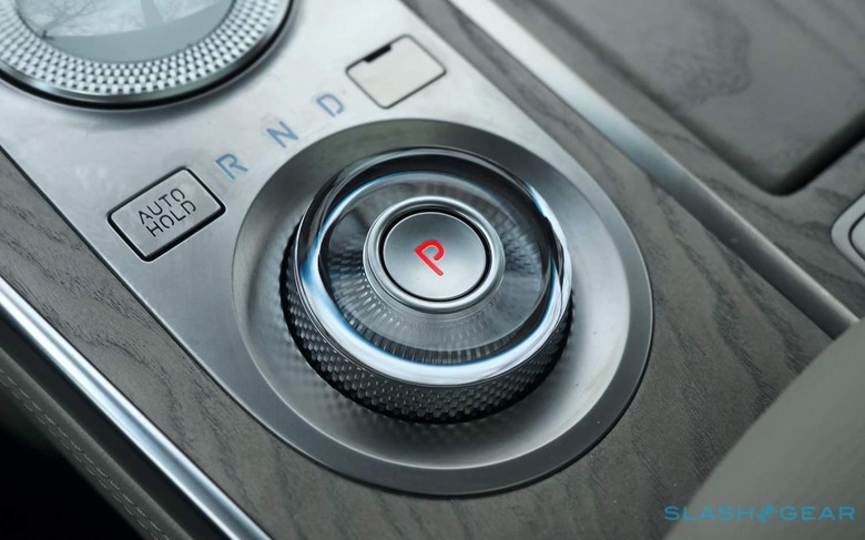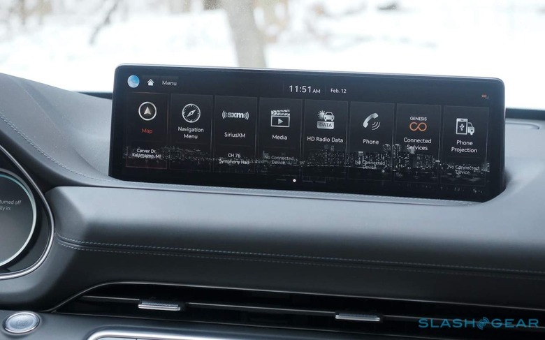 It's hard to get too upset about that once you're ensconced in the GV80's gadgetry. The wide touchscreen atop the center console is crisp and the infotainment system fast and easily navigated. You can reach out and tap, or scroll and swipe at the dished glass touchpad positioned just ahead of the rotary transmission selector. Only the half-digital cluster seems a misstep, with the analog speedo looking cheap next to the LCD panel.