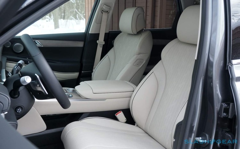 That's a rare stumble for Genesis here, though. What impresses on first glance, and continues to wow, is just how cohesive and thoughtful the GV80's cabin design is. From the knurling of the stalks and controls, to the frameless display for the HVAC system, and the lashings of soft-touch materials wherever your fingers might find themselves landing, it's a love-letter to ergonomics and aesthetics that most rival SUVs could do well to pay attention to. Even if you're not a fan of the rugby ball-shaped steering wheel, you can't deny that it feels premium with its machined switchgear.