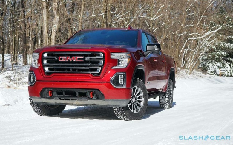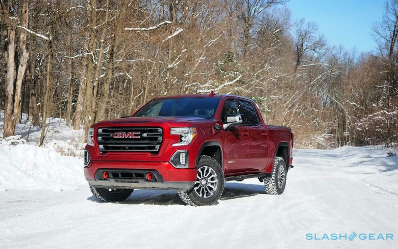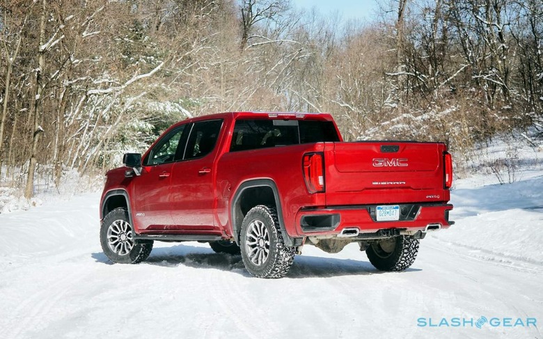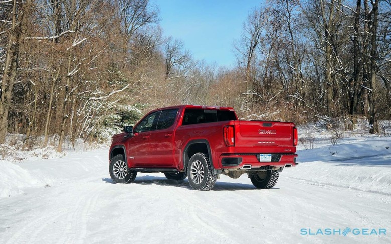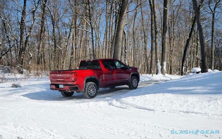 On the AT4 – sitting above the base Sierra, SLE, Elevation, and SLT versions, just below the most lavish Denali trim – that grille is body-colored, which helps reduce a little of the visual heft. It's also more of an excuse to splash on the glorious Cayenne Red Tintcoat paint, a $645 option which readily rivals Mazda's iconic red and pops nicely against the snow under the winter sun. LED headlamps and fog lamps are standard too, as is GMC's MultiPro Tailgate.