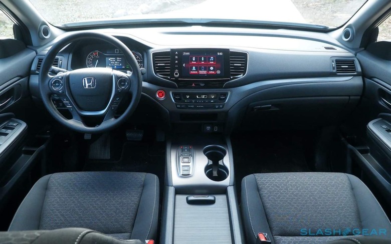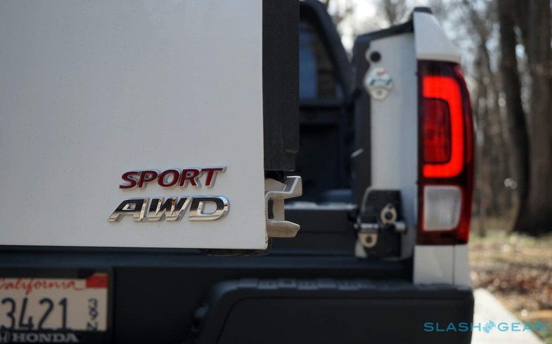 My Sport review model came equipped with the $2,800 Honda Performance Development (HPD) Package. That adds 18-inch HPD alloy wheels in a rather fetching gold, plus special fender flares, a unique grille, and – edging on a little too much for my tastes – various HPD decals and emblems. Alternatively there are more practically-minded options packs, like the $1,465 Utility Package with its running boards, roof rails, and crossbars, or the Function+ Package which, for $1,315, adds a hard tonneau cover, cargo nets for the bed and trunk, and cargo dividers.
