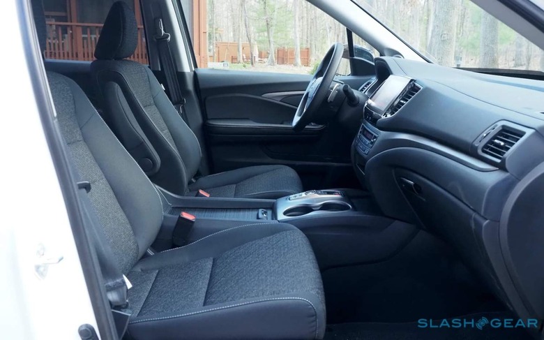 Inside, the changes are a little less dramatic. There's new cloth seats on this Sport trim, and new accents on the dashboard, center console, and steering wheel; all Ridgeline versions get new contrast stitching on the seats. Cubbies and bins aplenty ape the bed practicality, including a huge lidded central box and big door pockets. The second row gets plenty of legroom and a useful 2.9 cu-ft box under the bench. Everything feels sturdy and reliable, though that's not to say it's uncomfortable or spartan.