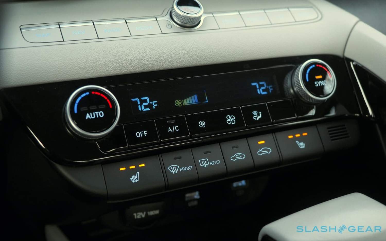I like it, even if I'm not sure how gracefully it'll age. The same could be said for the cabin, where a two-tone color scheme with asymmetric split pits a dark denim-esque fabric against lighter gray leather. Combined with the equally duotone dashboard, you'll either love it or you'll wonder if Hyundai's construction line robots got confused as they pieced things together.