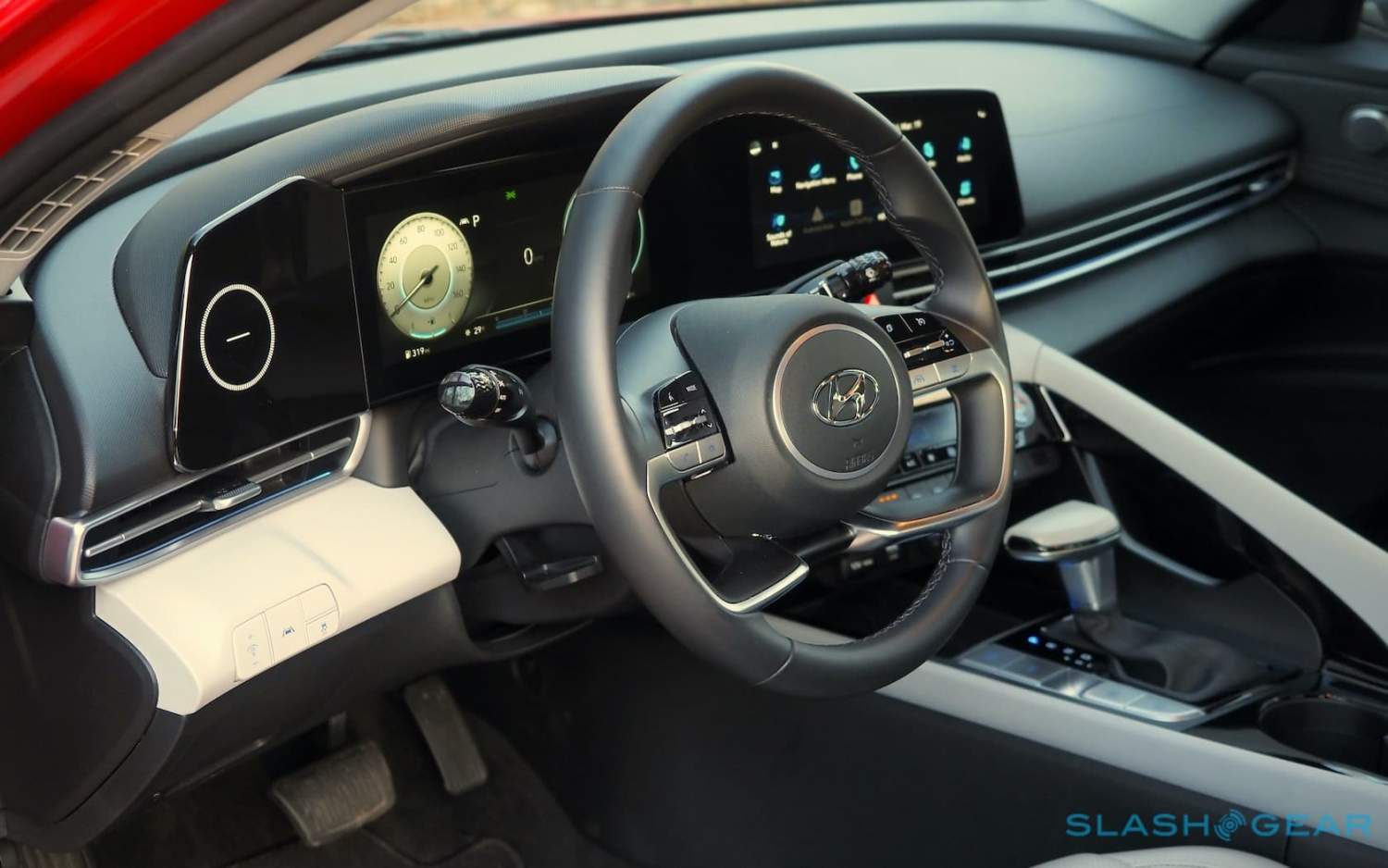 At $25,450 for this 2021 Elantra Limited (plus $1,005 destination) with the only options being $350 Calypso Red paint and $155 for the floor mats, you get an astonishingly upscale cabin, at least at first glance. Twin 10.25-inch displays grace the dashboard – one for the driver's instrumentation, the other an infotainment touchscreen in the center stack – and frankly wouldn't look out of place in a recent Mercedes. I suspect Hyundai has been sneaking samples out of stablemate Genesis' parts bins, too: the knurled, faceted stalk trim is like something you'd get in the more expensive cars.