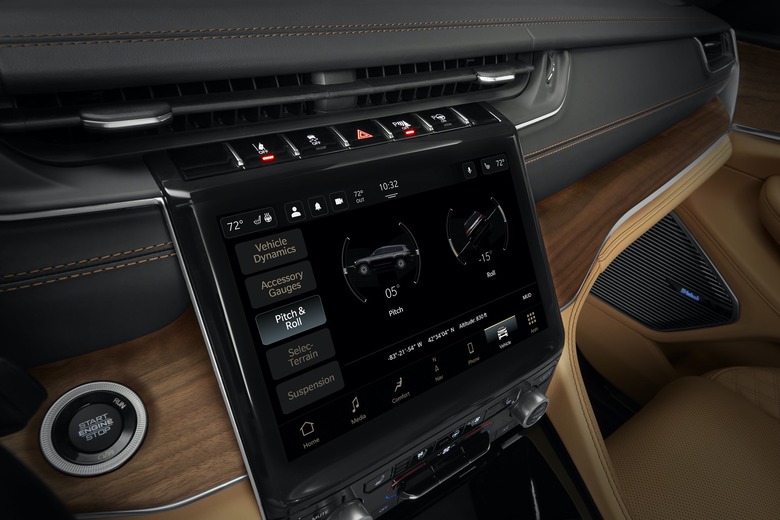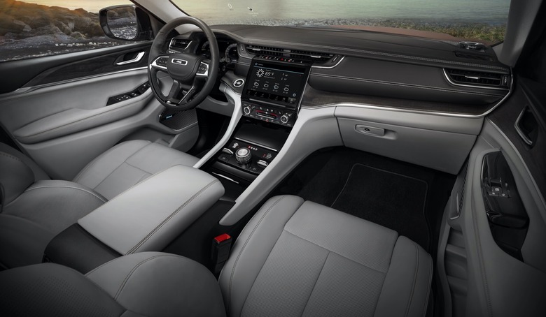 Inside, the biggest news is the option of six or seven seats for the first time. Jeep has paired that with new materials, like real metal, open-pore wood, and leather. The dashboard gets either an 8.4- or 10.1-inch touchscreen for Uconnect 5 – with wireless Apple CarPlay and Android Auto – and there's a 10.25-inch digital cluster for the driver. Two Bluetooth phones can be connected at the same time, and there's Alexa, maps, a 4G LTE WiFi hotspot, and SiriusXM. Transmission control is now by a metal shift knob with haptic feedback, flanked by ride-height and Selec-Terrrain controls.