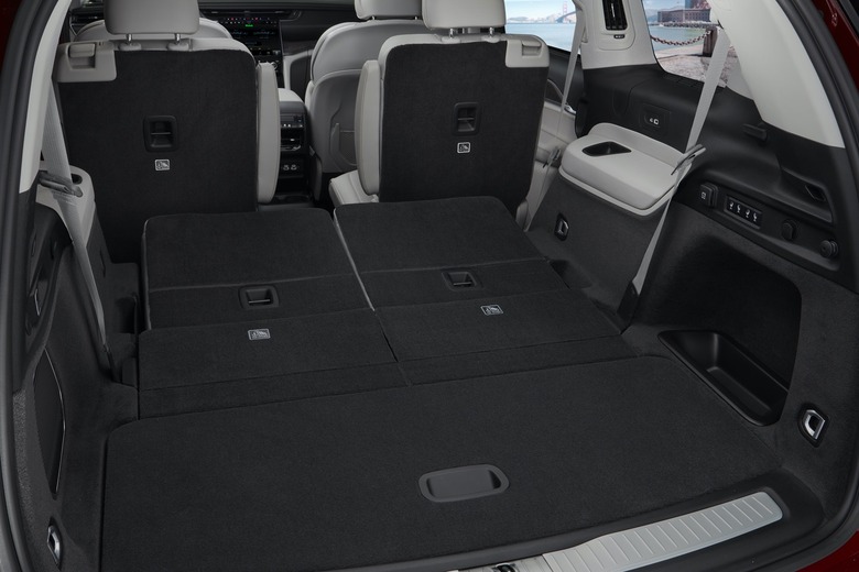 The second row has tip-and-slide bucket seats that recline 18-degrees, or an optional bench, and can slide 7-inches front and back. A power-folding third row is optional, with 50/50 split. Second and third row seats can fold into a flat load floor, boosting the total cargo space from 17.2 cu-ft behind the third row, to 46.9 cu-ft behind the second row, to a maximum of 84.6 cu-ft. Overland and Summit trims get remote second row folding, and all but the base trim have a programmable-height power lift gate.