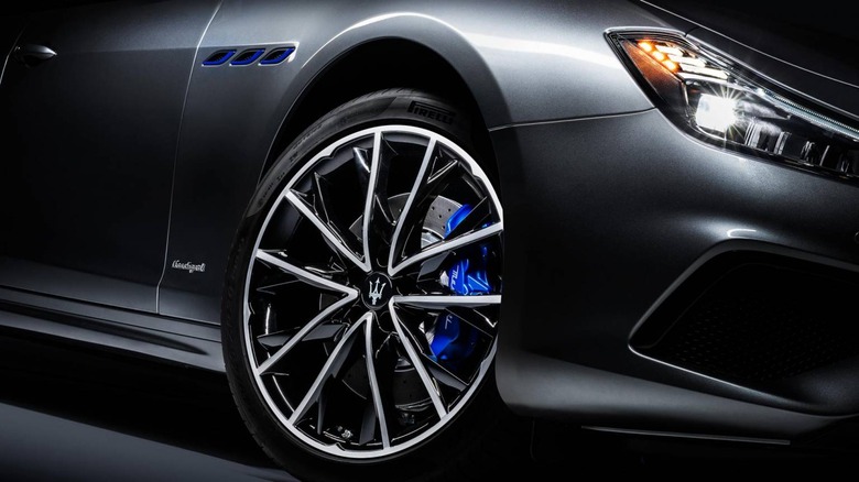 At first glance, the Ghibli Hybrid resembles a standard gasoline-only Ghibli. But to make it stand out, the hybrid is distinguished by light-blue accents on the rear pillars, side air ducts, brake calipers, and in Maserati's trident logo. The Ghibli Hybrid also gets a slimmer front grille and new taillights. Inside, the hybrid theme continues with light-blue embroidery on the seats.