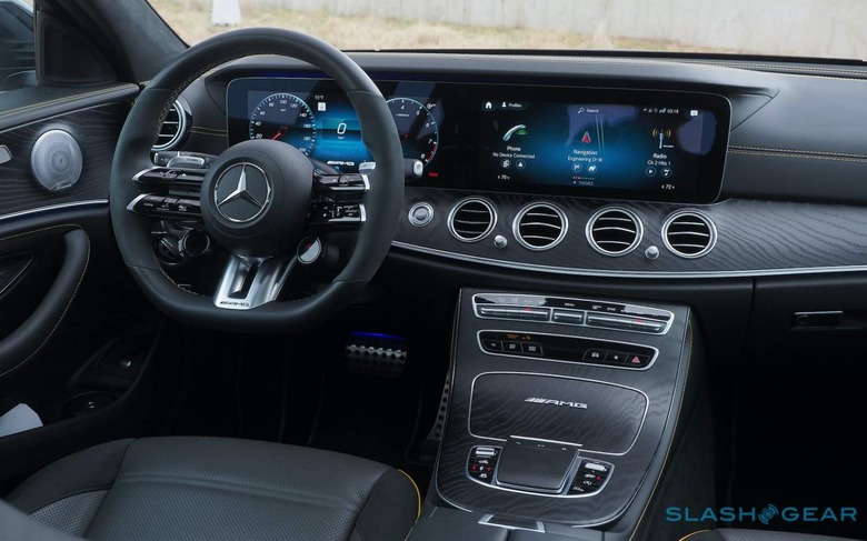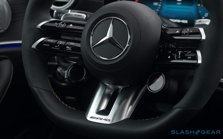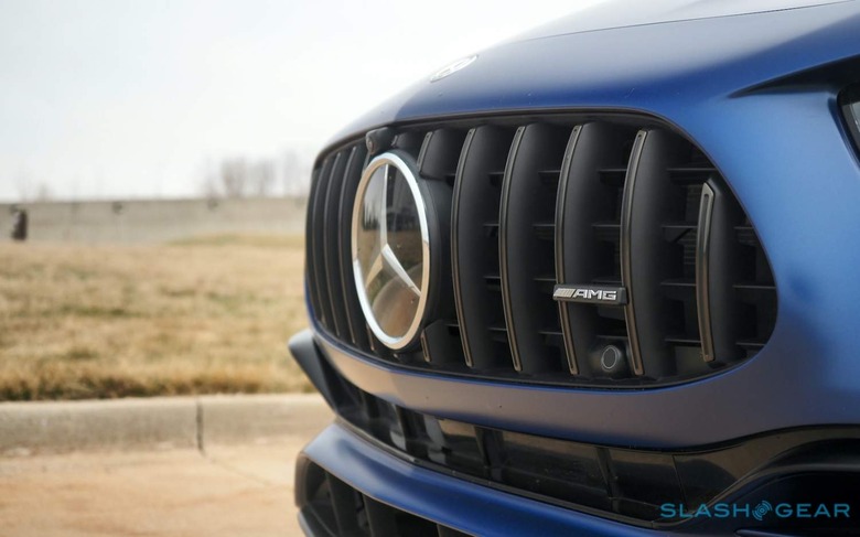 To give it its due, the AMG commits to that masquerade. Along with the spacious cabin there's a long list of safety tech. Automatic emergency braking, blind-spot assistance, 360-degree camas, and active parking assist are all standard. The Driver Assistance Package adds adaptive cruise control with lane-keeping and auto lane-change, active brake assist with cross-traffic, eves steering assist, active lane keeping and blind spot, assist, route-based speed adaptation, rear-end collision protection, and more.