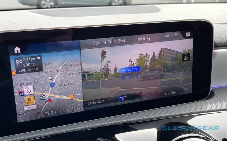 The current iteration of MBUX does have AR navigation as an option, and you can add a HUD, but the two systems aren't in fact integrated. Instead, as it operates today, the AR directions are overlaid onto a view ahead of the car on the center infotainment display, as seen from a front-facing camera. It's clever, but it does require glancing away from your direct view of the roadway.