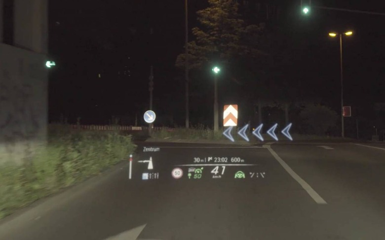 This new AR HUD has no such problems. Since you look "through" the screen, which is projected on the windshield, Mercedes can overlay animated arrows that track upcoming turns and junctions. The arrows gradually blink out as the maneuver approaches, moving around the HUD as the car itself reorients.