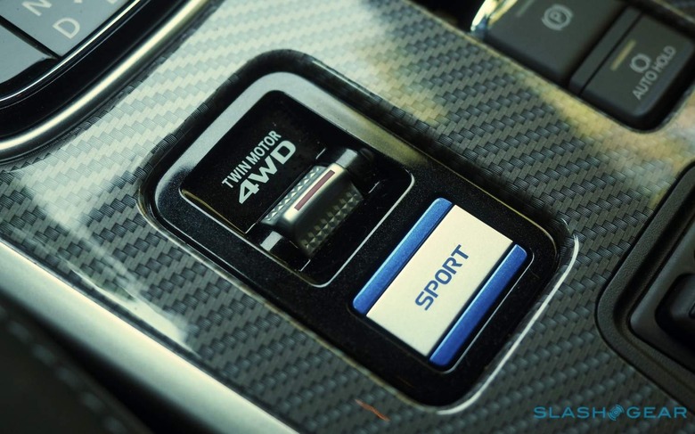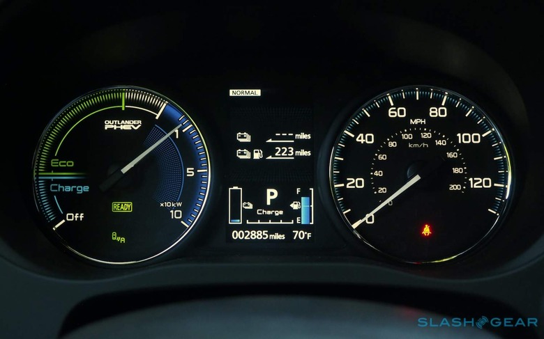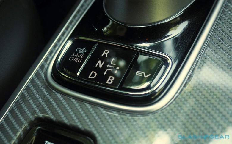 The Mitsubishi handles all that itself, but you do get some control over how the battery is used. Hit the "EV" button and the Outlander PHEV will try to use electric power alone for as long as that's feasible; press the "Save Charge" button and it'll preserve the current state of charge for you to use later on. Press that button again, and the SUV will actively try to recharge the battery with the gas engine, though it's not a particularly efficient use of gas.