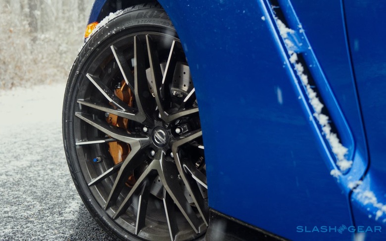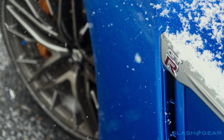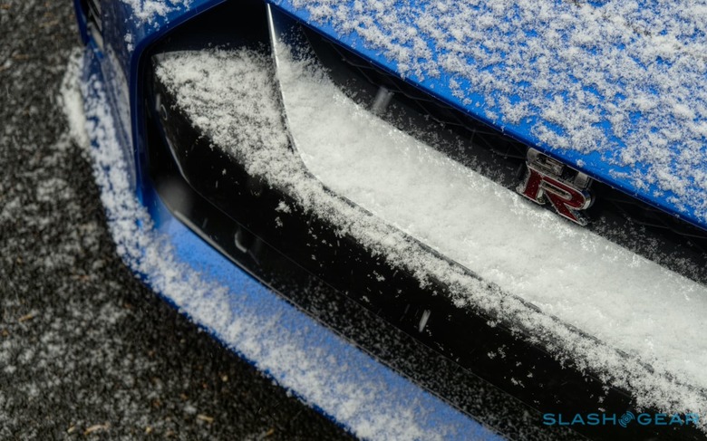 This GT-R, though, wasn't waiting for the thaw. Gone was the standard-fit Dunlop SP Sport Maxx high-performance rubber, Godzilla having slipped into a set of Bridgestone Blizzak winter tires instead. I paired that with some timely Midwest snow.