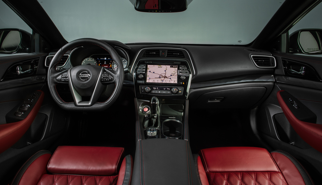 On the inside, the Maxima Platinum's Reserve package is evident. You get red semi-aniline leather upholstery with embossed 40th Anniversary logos, contrasting red interior stitching, satin dark chrome accents, heated rear seats, and white instrument gauges similar to the 1995 Maxima that won Motor Trend's ICOTY award. The 2021 Maxima 40th Anniversary Edition is fully loaded with power seats, Apple CarPlay and Android Auto connectivity, and an upgraded Bose audio system with 11 speakers.