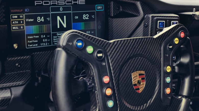 Porsche pays attention to its pilots, too, and the 911 GT3 Cup obliges with a two-stage height-adjustable racing seat, an adjustable steering column, and an open-top carbon-fiber steering wheel with illuminated buttons.