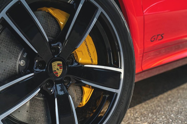 Both the SUV and the GTS Coupe look the part, too. Porsche makes the Sport Design package standard, blacking out the exterior badging, front air intakes, side trim, and tailpipes, and applying a dark tint to the Porsche Dynamic Light System LED headlights and taillights. 21-inch RS Spyder Design wheels are finished in matching satin black, with beefy Brembo brakes clear through their slender spokes.