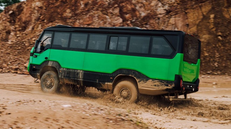 Also new is a modified 6.9-liter six-cylinder diesel engine pumping out 286 horsepower and a gargantuan 848 pound-feet of torque, with more power and twist than last year's diesel mill. It now has a revised 4x4 transmission that's tough enough to motivate the bus over 65-percent inclines.