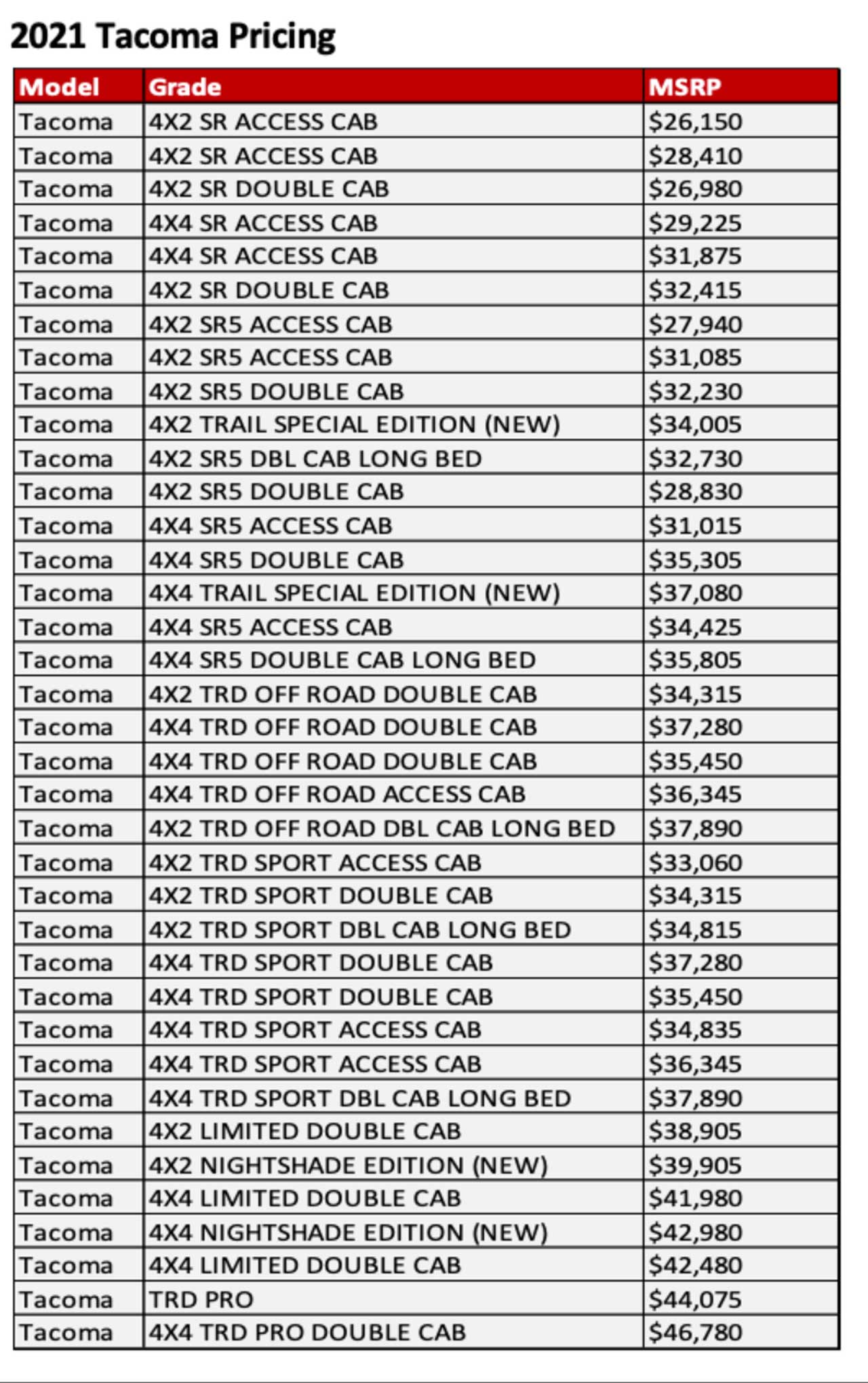 Toyota has announced the pricing for the 2021Tacoma mid-size pickup line. Toyota brags that the Tacoma has been the best-selling mid-size pickup for the last 15 years. For 2021 Toyota has unveiled all-new special editions, adjusted colors, and made enhancements across the entire line.