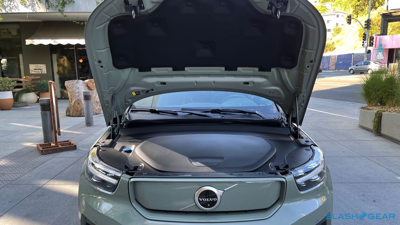 That's not the only reinforcement, mind. The XC40 Recharge also gets a new, fortified underbody structure in the front, housing the power electronics. It leaves just enough space to spare for a small "frunk" under the hood, although the roughly 1 cu-ft there is really just enough for a small backpack and the provided charging cable.