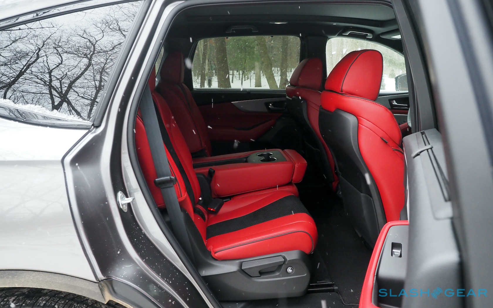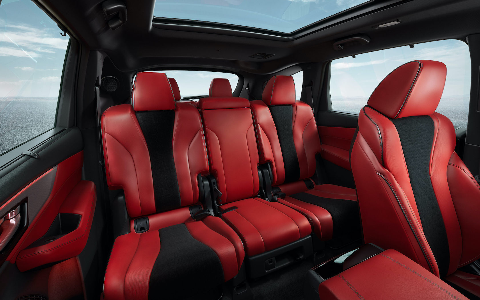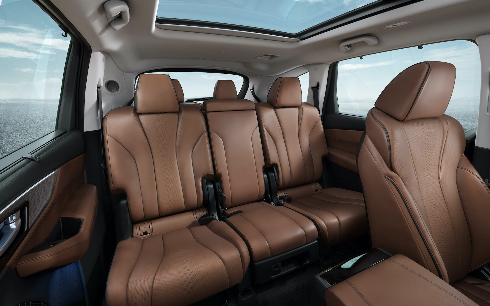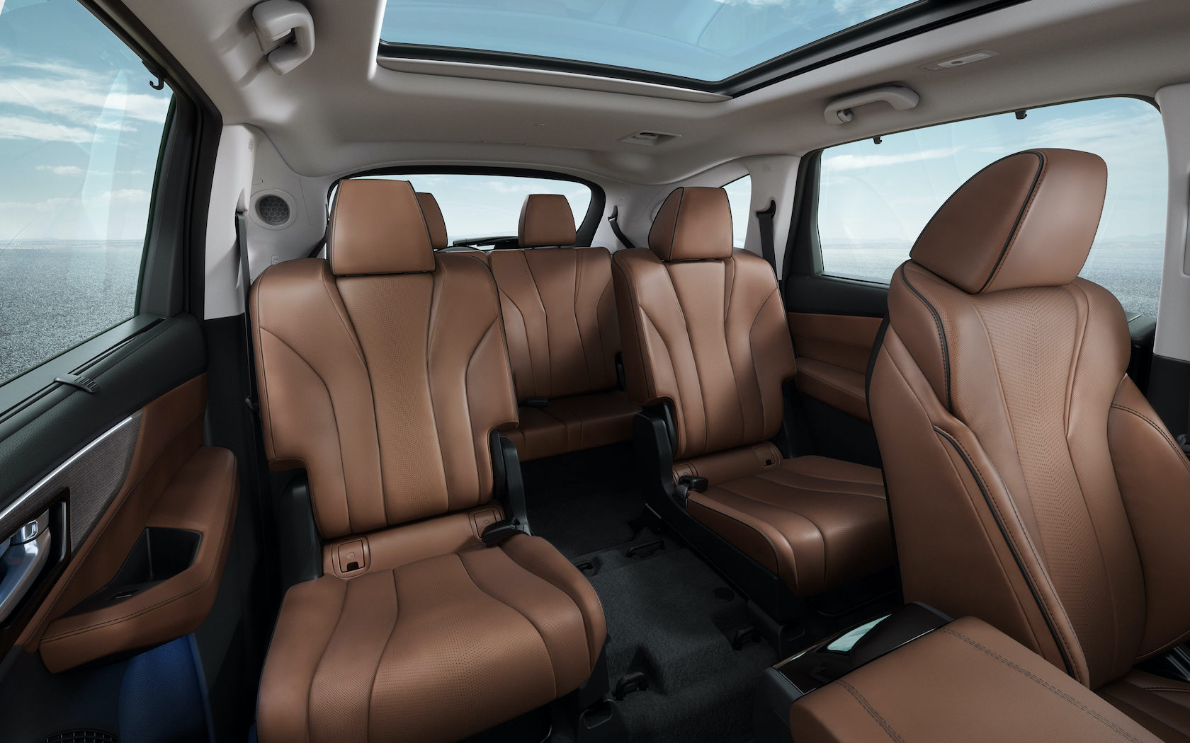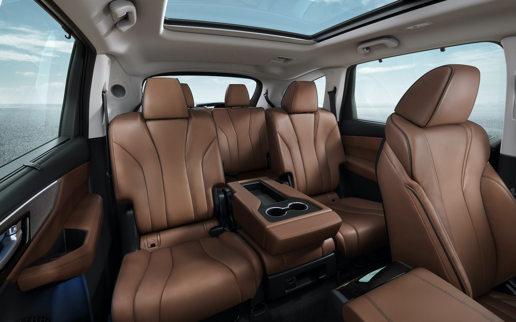 Inside, there's room for up to seven across three rows. All sit underneath a full panoramic moonroof as standard; the middle row can either seat three, or have the center seat fold down as an expansive armrest. Remove it completely, and you have easier pass-through access to the last row. Headroom and legroom is up across the board, thanks to a stretched wheelbase.