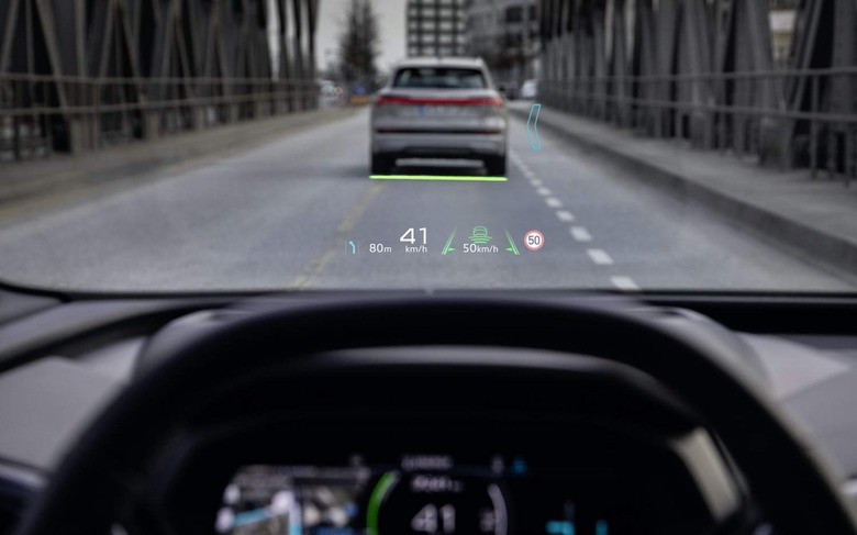 That can be used by the navigation system, for example, hovering animated directional arrows over the upcoming turn. It's the equivalent, Audi says, of looking at a 70-inch display floating around 33 feet ahead of the car. A second, "closer" layer of the HUD is reserved for things like speed and battery status. In Q4 e-tron models with Adaptive Cruise Assist, the HUD shows graphics which explain what the system is doing, and when the driver might need to take over.