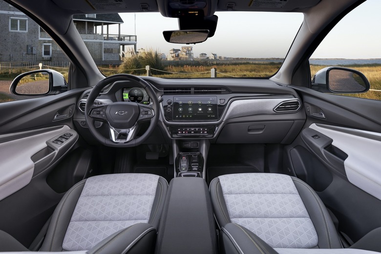 Inside, there's a 10.2-inch infotainment touchscreen with wireless Apple CarPlay and Android Auto. It also now includes the HVAC controls, and there's a wireless phone charging pad. The driver gets a dedicated 8-inch cluster display and a new electronic gear shifter with buttons and toggles. A one-pedal regenerative driving mode can be accessed with a button, and the Bolt EUV remembers your preferred setting even after you restart the car.