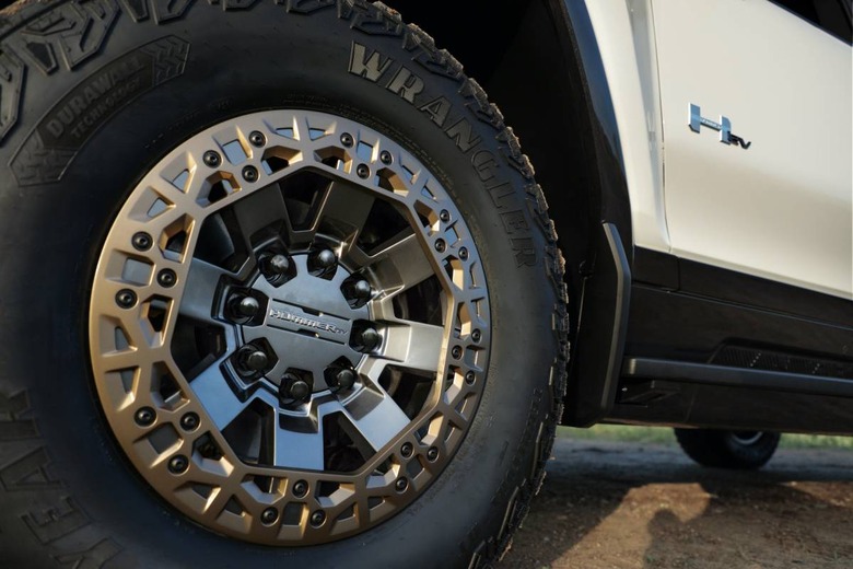 A rear virtual locker, meanwhile, simulates a locking diff for the dual-motor rear Ultium unit. It can do torque vectoring, too, pushing power from side to side depending on grip and traction conditions. Heavy-duty ball-spline half shafts keep axle articulation at its maximum, and 18-inch wheels with 35-inch Goodyear Wrangler Territory MT tires are fitted as standard. There's room, though, for up to 37-inch tires if you prefer.