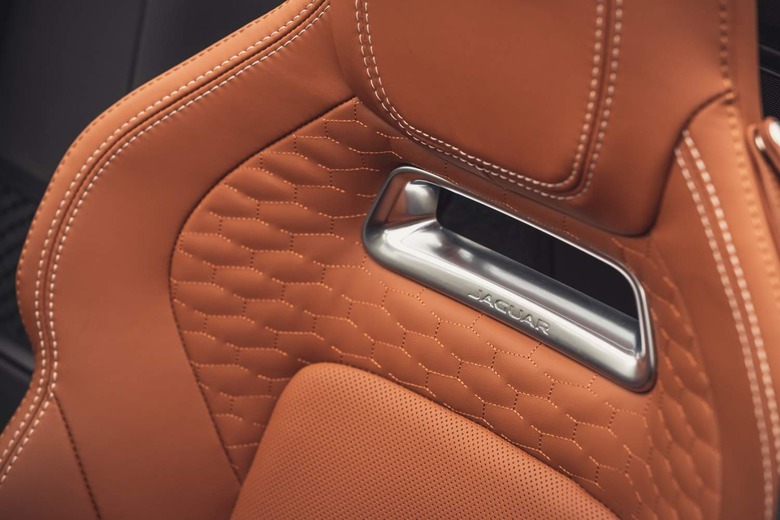 Jaguar has added monogram stitch patterns in the seats and door trims, along with logos in the headrests. The F-TYPE P450 RWD gets six-way electric power seats, while the F-TYPE P450 R-Dynamic AWD gets 12-way electric seats with memory, a power steering column with memory, Delta Aluminum center console, and R-Dynamic metal tread plates.