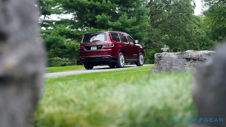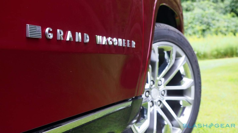 I'm not entirely sure it's consistently handsome, overall, from every angle, but it's definitely noticeable. There's more chrome and general glitz than you'd expect from a typical Jeep, too; the model lettering and accompanying American flag are picked out in chunky metal. I like the front and the rear views more than the side profile, where even the blacked-out roof can't quite disguise the Grand Wagoneer's swollen proportions.